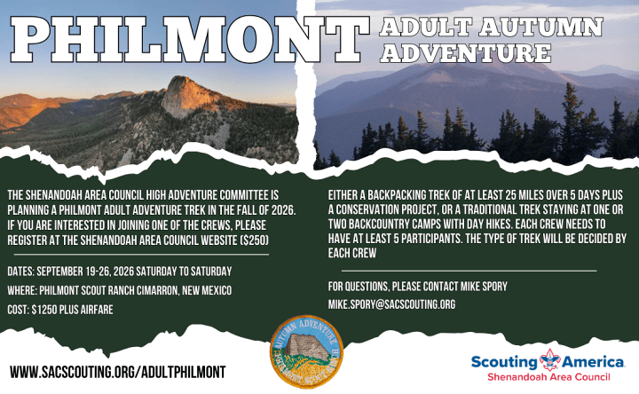 The Shenandoah Area Council High Adventure Committee is in the initial planning stages for a Philmont Adult Adventure Trek in the Fall of 2026. If you are interested in joining this Philmont Crew, contact Mike Spory.